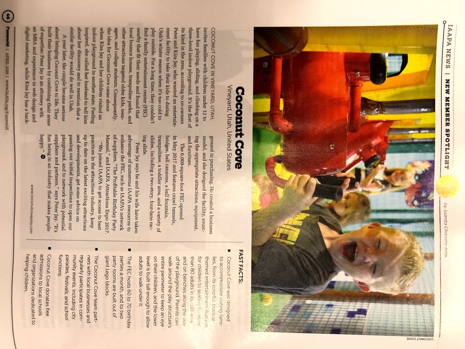 Coconut Cove Indoor Playground was recently featured as the new member spotlight for the month of April in Fun World Magazine and the International Association of Amusement Parks and Attractions. The article featured on the IAAPA website highlights the story behind Coconut Cove and how owners Peter and Kira Jay brought their vision to life for a family friendly entertainment center that they would want to bring their young kids to. Since its opening last May, Coconut Cove has seen an extremely positive response from the Utah Valley community. Throughout the last year, Coconut Cove has participated in parades and conventions, and hosted their own family night events and birthday parties. The Indoor Playground has about 60 to 70 kids birthday parties a month, making it one of their most popular activities. Peter and Kira have used resources from IAAPA to enhance their business.